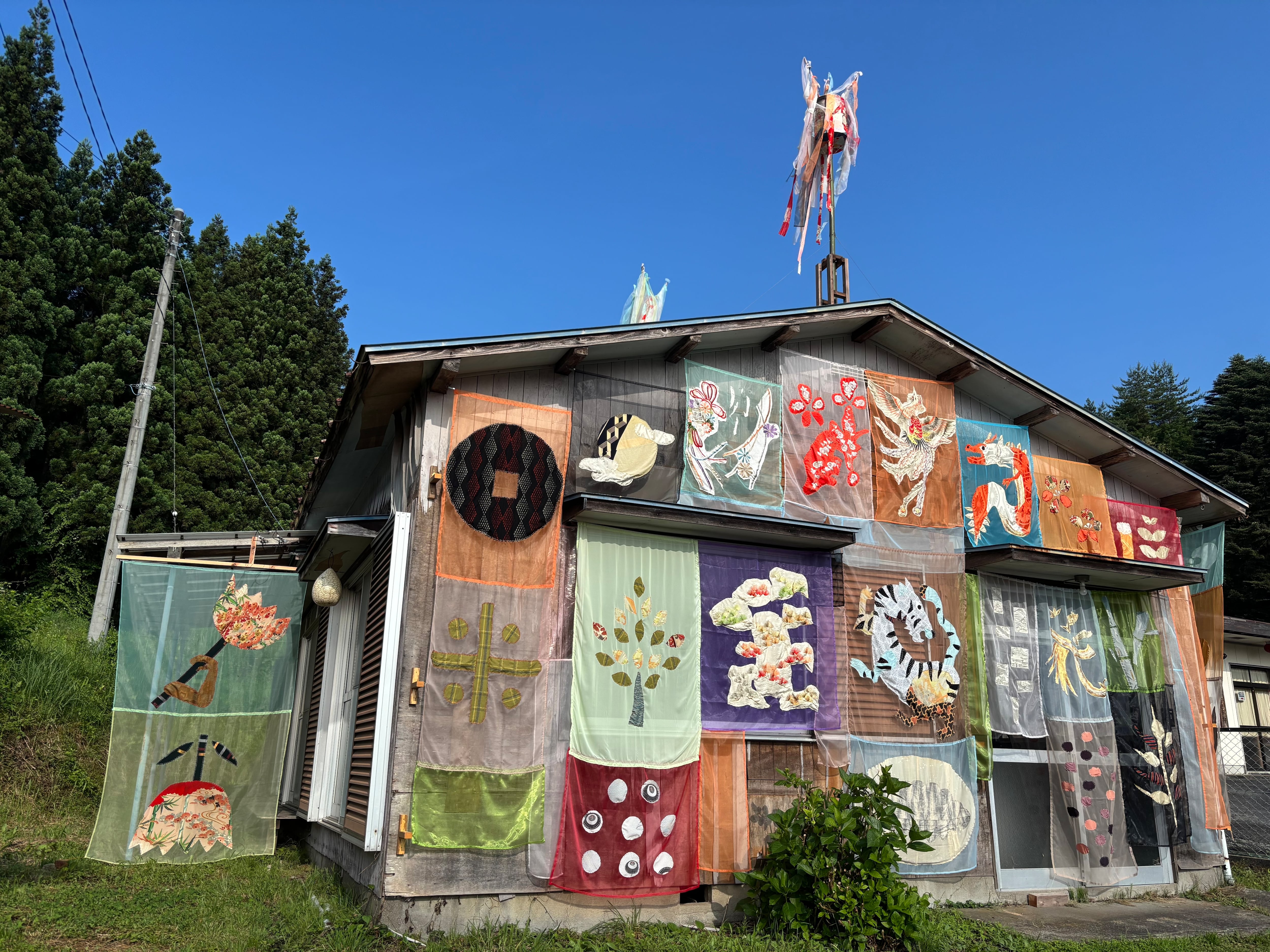 中之条ビエンナーレ2025、伊参集会所で発表した作品の、建物の外側を飾った布作品です。